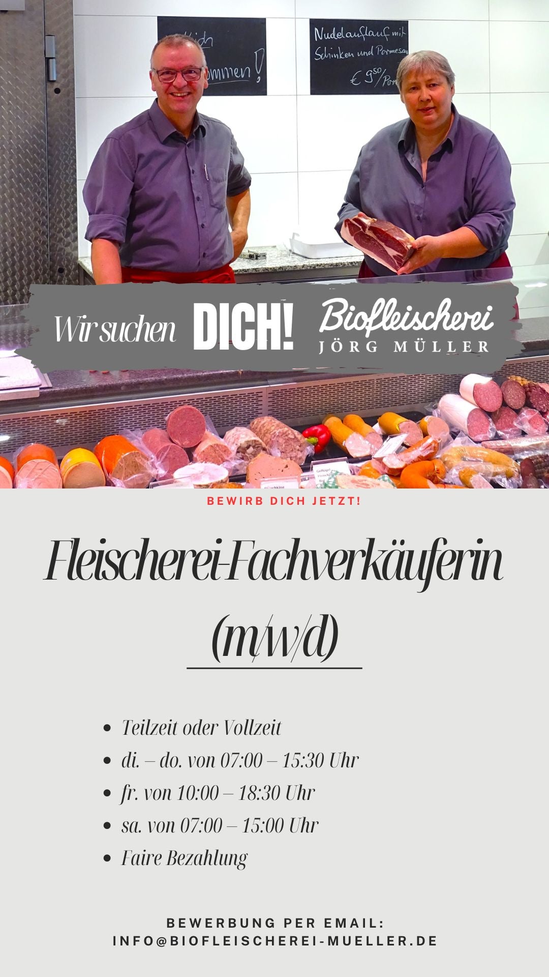 Wenn Du Teil eines Unternehmens werden möchtest, das Werte wie Nachhaltigkeit, Qualität und Teamgeist hochhält, dann zögere nicht! Bewirb Dich noch heute und gestalte mit uns die Zukunft unserer Biofleischerei!
