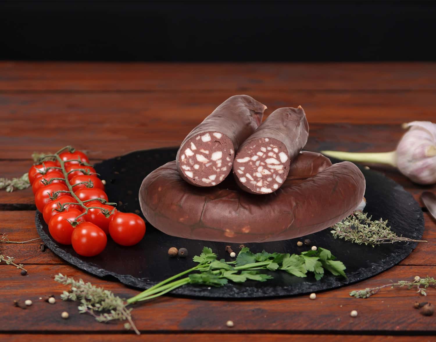 Die geräucherte Blutwurst aus eigener Herstellung entwickelt durch Zugabe von Naturgewürzen einen ganz eigenen, kräftigen Geschmack. Mit kleinen Fleisch- und Speckstückchen versehen wird sie im Naturdarm abgefüllt, gegart und kräftig geräuchert. Die schnittfeste Wurst eignet sich als deftiger Brotbelag, kann aber in Mehl gewälzt auch zum Braten als Ergänzung zu Kartoffelstampf verwendet werden.