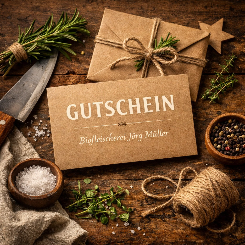 Mit dem Geschenkgutschein der Biofleischerei Jörg Müller verschenkst Du ehrliche Bioqualität und echtes Metzgerhandwerk – ganz flexibel und unkompliziert.